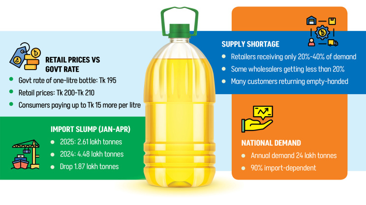 Retailers were selling bottled soybean oil at Tk 5 to Tk 7 above the maximum retail price printed on the packaging. Traders say they are receiving less than 20 percent of their usual supply.