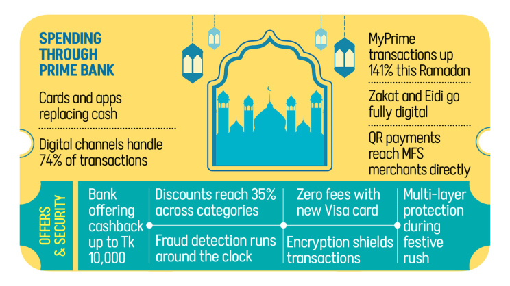 To capture that appetite, Prime Bank is running Ramadan and Eid offers that include cashback of up to Tk 10,000 and discounts of up to 35 percent across electronics, lifestyle, furniture, groceries, ticketing, and leading online platforms. Restaurant platter deals round out the offer for cardholders.
