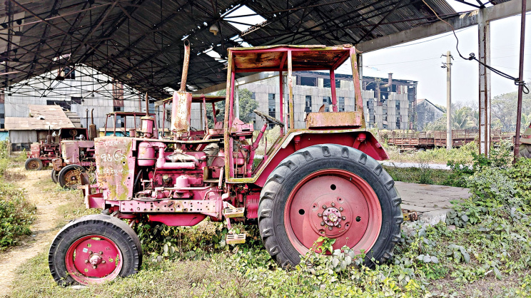Established in 1965, Shyampur Sugar Mills spans 111 acres. Since its closure, more than a hundred tractors, various vehicles and equipment have been lying unused and neglected inside the premises. Many of these have become damaged. Some functional equipment has been transferred to other operating sugar mills in the country.