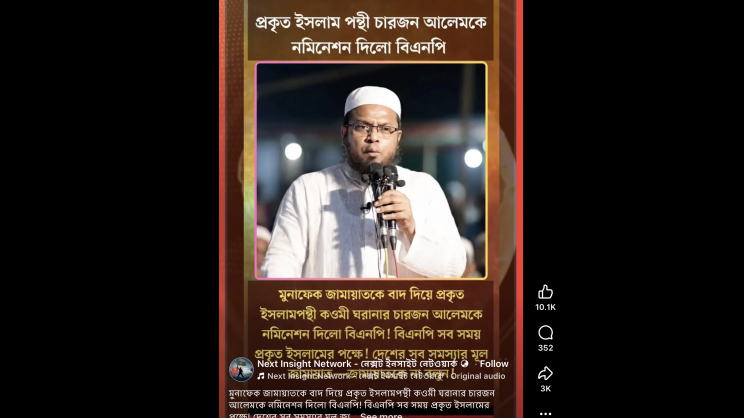 Several pro-BNP posts deployed AI-generated figures dressed in traditional attire commonly associated with Islamic preachers, using them to denounce Jamaat. In one example, a 16-second reel posted by Next Insight Network featured such a figure vehemently criticising Jamaat for allegedly deviating from the principles of Islam practiced in Madinah. He also claimed that BNP leaders were educated in secular institutions rather than in madrasas.