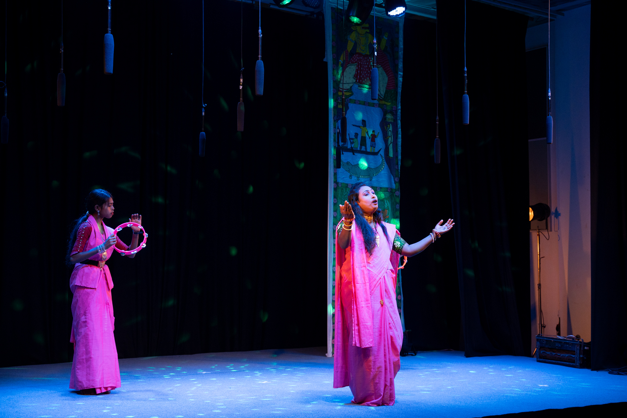 “We worked around only one river, the Malancha River in Satkhira, where we worked across three villages. Of the three villages, one had a Muslim majority, one had a Hindu majority, and one had a mixed population. In the three villages, we noticed variations of rituals, practices, and faiths, but all of them were bound by one core factor. As everyone relies on the jungle, space is reserved for Bonbibi. This is what we kept in mind when we began the cultural production. So, we picked out two forms: Patachitro and Pala,” Hasib Zuheri Shihan explained.