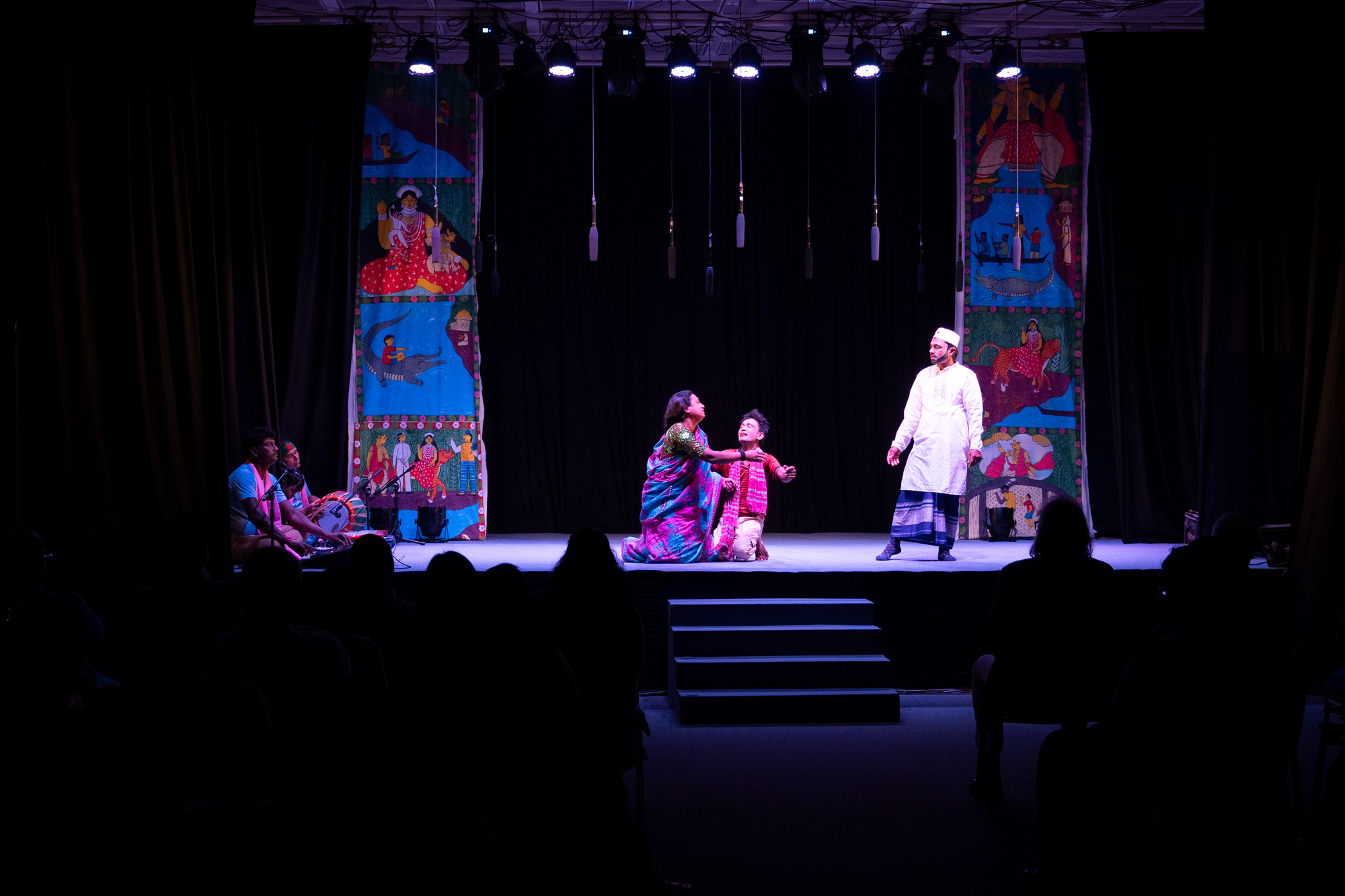 Alongside the four artworks and the Pala, research from The Heritage and Technology Integration Cell, BUET, and Riverine People exhibited illustrations that offered insights into settlement patterns, infrastructure, myths, and ecological systems. The visualisations were executed in the style of traditional Gazir Pot scroll-painting style to pay homage to the roots of the region. Additionally, a series of photographs documented how the project came together by capturing locals and members of the project at work.
