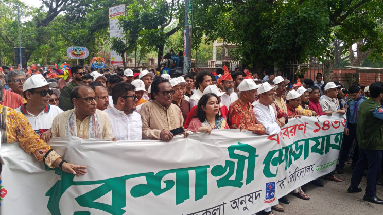 The procession began from Gate 3 (north) of the Faculty of Fine Arts and proceeded towards Shahbagh Police Station, where it took a U-turn. It then moved past Raju Sculpture and the TSC premises on the right, continued through Doel Chattar and in front of Bangla Academy, before returning to the Faculty of Fine Arts, where the procession concluded.
