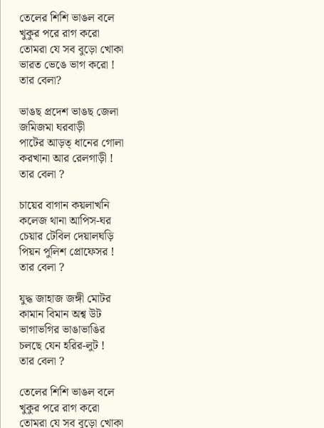 That capacity was also explored differently by Sukumar Ray in "Abol Tabol", where nonsense becomes satire, and by Rabindranath Tagore, who collected and analysed children’s rhymes as part of a broader cultural inquiry. Later, Annada Shankar Ray would push the form into direct political commentary, proving that brevity need not limit ideological force.