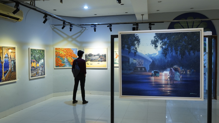 The exhibition presents scenes drawn from familiar landscapes. Earthen roads, quiet canals, riverbanks, and agrarian surroundings appear throughout the works. These images are not imagined abstractions; they are grounded in observation and recollection. The lives of ordinary people and their everyday environments take central focus.