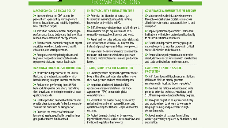 Bangladesh faces a precarious economic landscape marked by plummeting GDP growth, rising poverty, and high inflation. To reverse this, reforms must prioritise fiscal sustainability, balance of payments (BOP) stability, and restoring the banking sector’s health. Currently, the government is unsustainably borrowing from banks to cover current expenses. Fiscal recovery requires raising the tax-to-GDP ratio from 6.5 per cent to 10 per cent by shifting toward income-based taxes and transforming state-owned enterprises into profit-yielding assets. Furthermore, eliminating non-essential energy and export subsidies could save nearly 2 per cent of GDP, allowing for doubled spending on health, education, and social protection. Finally, with non-performing loans reaching 36 per cent, the banking sector faces a serious risk of instability. To prevent further decline, two urgent steps are needed. Banks that do not meet Basel III standards should be restricted from issuing new loans and operate in a limited capacity. At the same time, all banks must focus on recovering existing loans. Lending should only resume once they meet the required standards through recovery efforts and fresh capital injection.