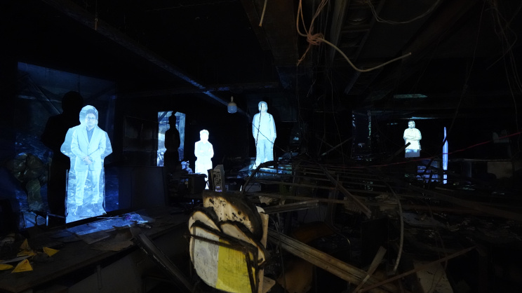 In one installation, pigeons move freely across a fire-damaged floor, navigating desks and scattered remnants. Their presence suggests continuity amid disruption, a living counterpoint to destruction.