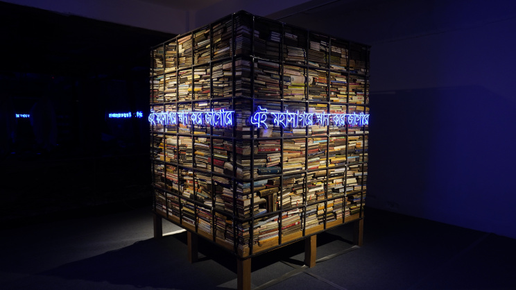 Burnt books were later displayed in a transparent case inside a partially intact room. Beyond it, blackened remnants filled the space, suggesting both loss and continuity. One installation features a steel lock marked with footprints; a stark symbol of forced entry. Another binds together surviving books under the inscription: “Ei mohashagore snan kore jagore” (Awaken and bathe in this great ocean), underscoring knowledge as a force that endures beyond violence.