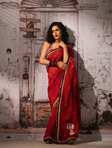 Many designers have given a modern twist to handloom fabrics such as Muslin and Rajshahi silk, which are lovingly embroidered with karchupi, aari, and zardozi, but the blouse is the main character. With ruffles like clouds around the neckline of the blouse, the outfit is instantly elevated from traditional to high fashion!