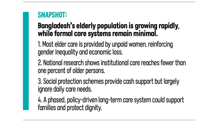 Bangladesh stands at a demographic crossroads. If we act now, we can build a care system that supports women, protects older persons, and strengthens families. If we wait, the burden will fall silently and disproportionately on those least able to bear it.