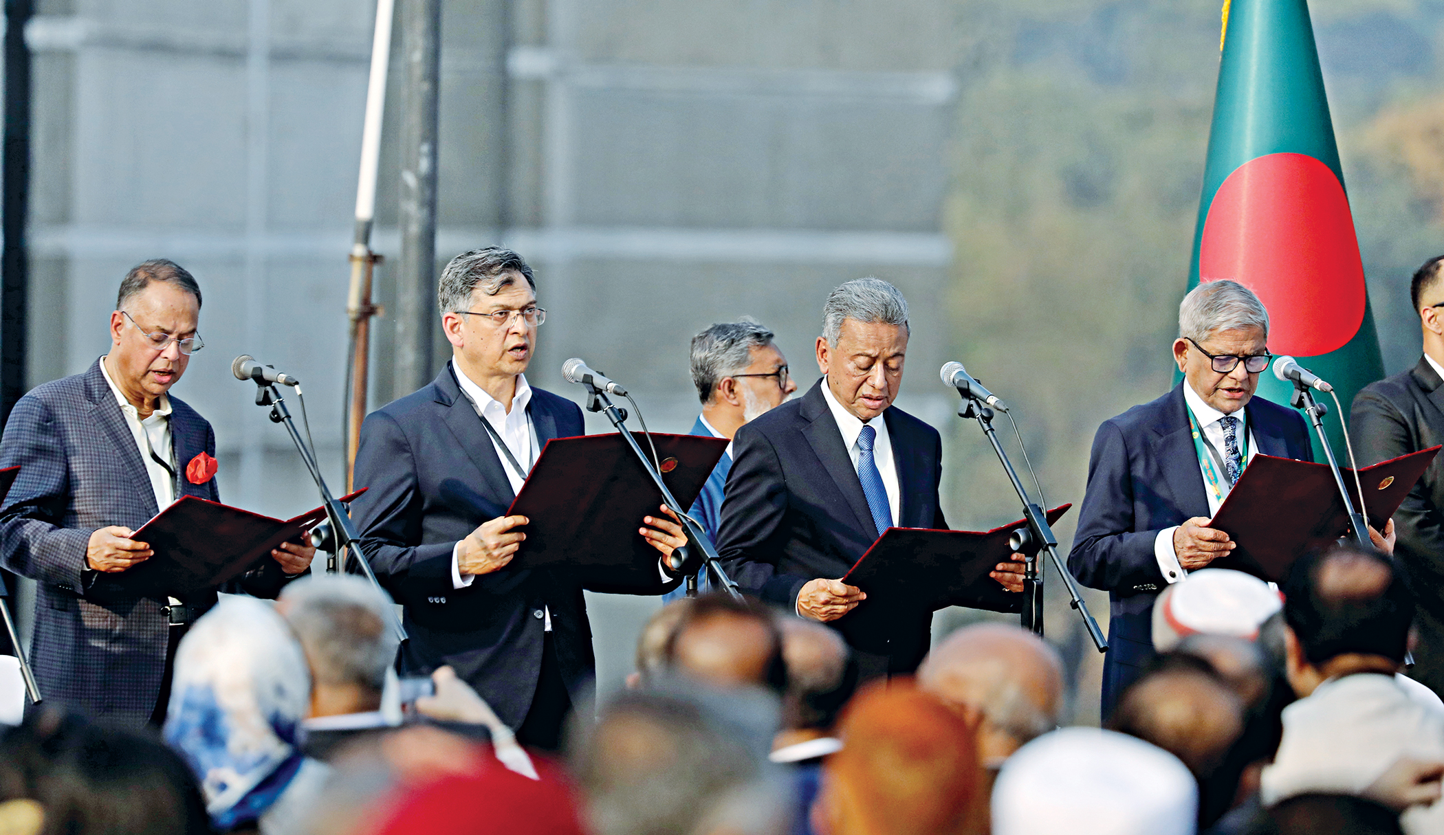 Ministers taking oath at the South Plaza of the Jatiya Sangsad Bhaban yesterday afternoon.
