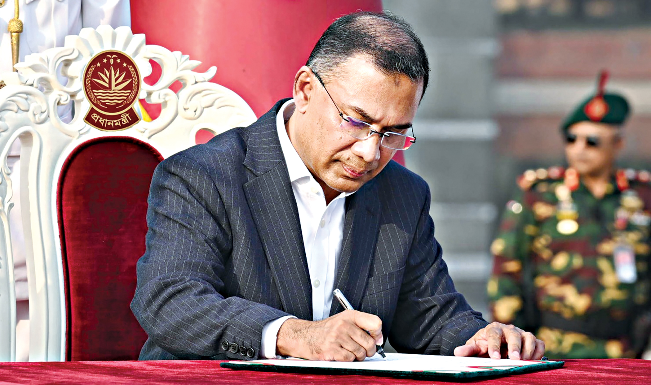 BNP Chairperson Tarique Rahman signing the oath register after being sworn in as prime minister of Bangladesh at the South Plaza yesterday afternoon.