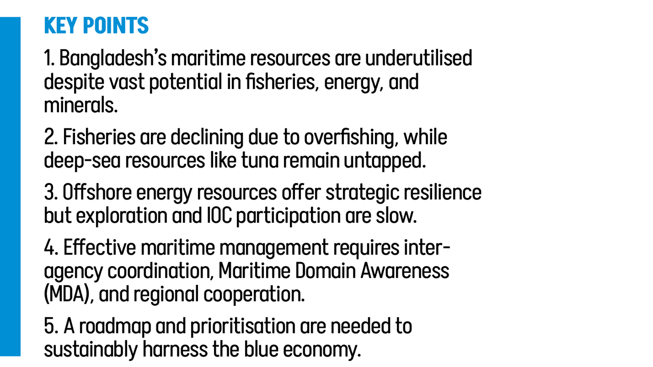 There have been extensive suggestions and recommendations, in addition to efforts to decipher the potential of Bangladesh in utilising its maritime resources. Thus, potential and the suggestive narrative have dominated so far. It is high time the concerned agencies reviewed these recommendations and identified the mammoth tasks ahead. Without devising a roadmap or concerted coordination efforts, valuable resources may be expended on initiatives that are not aligned with national interests.