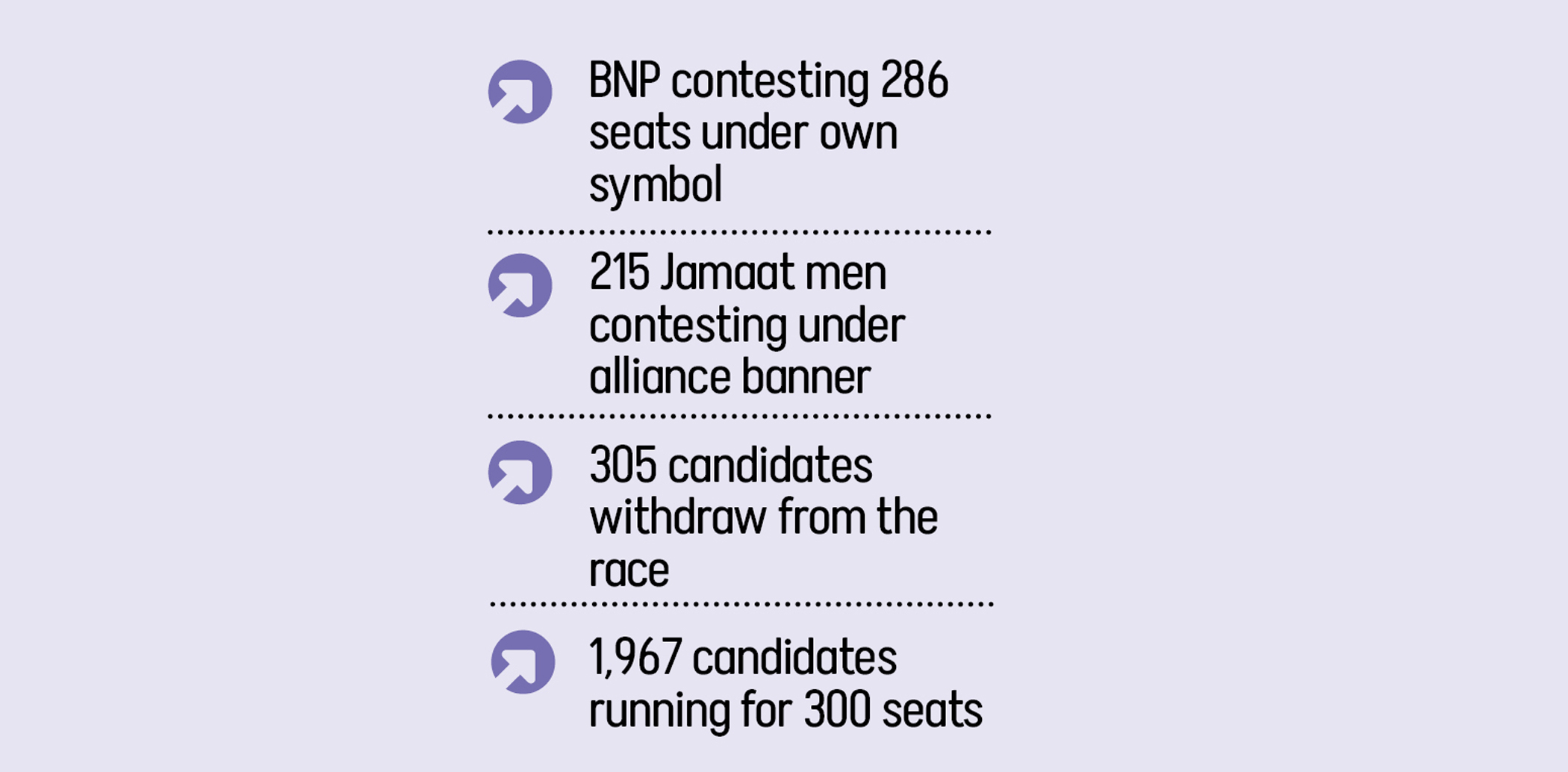 Even after withdrawals, Jamaat-backed candidates have rivals from within their alliance in at least seven constituencies.
