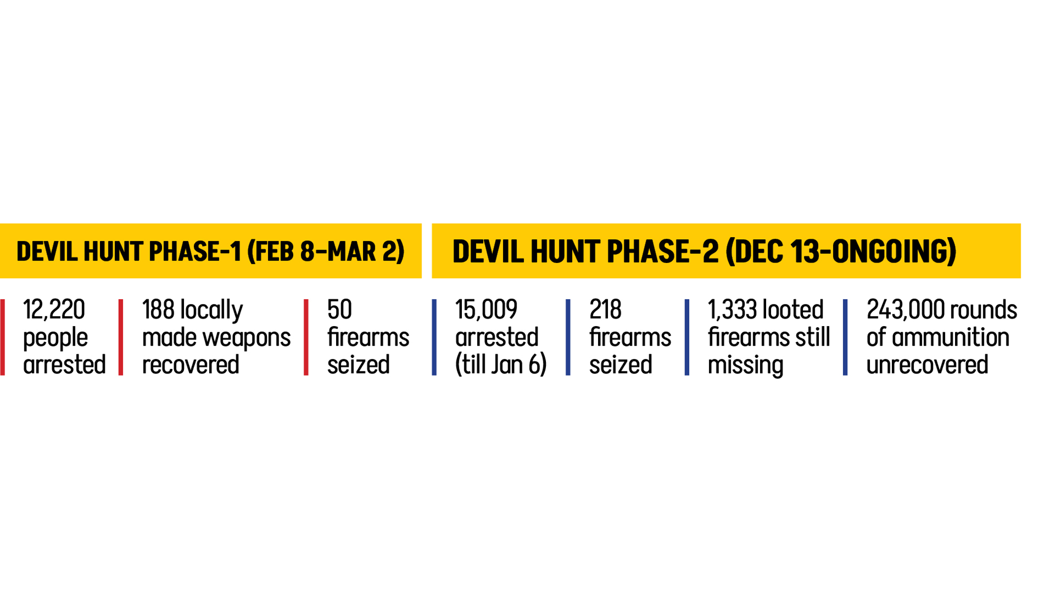 During the first phase, from February 8 to March 2 last year, 12,220 people were arrested, while 188 locally made weapons and 50 firearms were recovered.