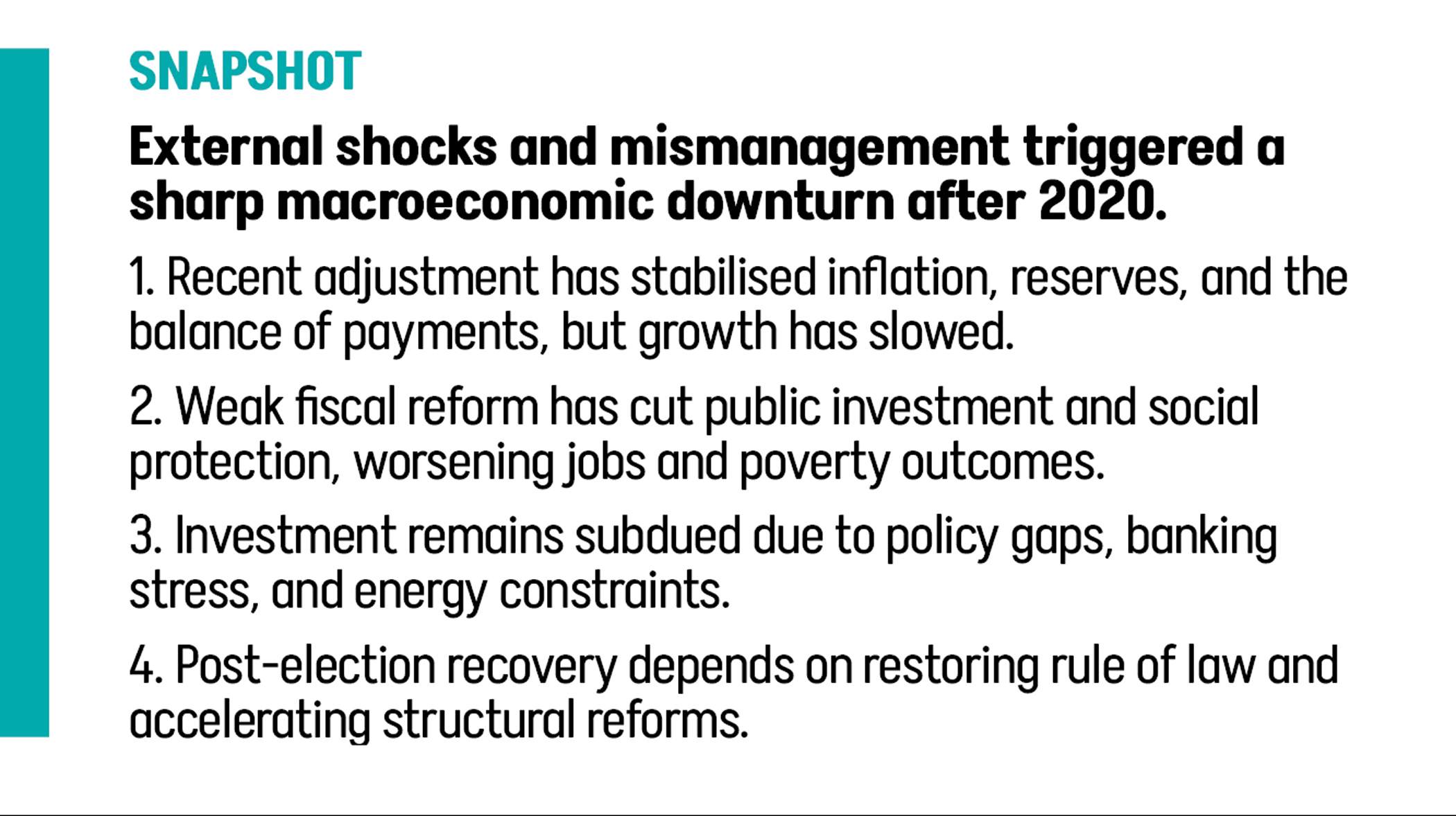 What is the way forward? Unfortunately, there are no quick fixes and a concerted policy reform effort encompassing several reform areas will need to be sustained over an extended period. The upcoming national election presents a major opportunity to turn around the economy. The biggest plus the elections offer is the opportunity to lower political uncertainties and restore the rule of law. A credible and participatory national election will be key requirement for this. Following the election, a quick restoration of the rule of law irrespective of political connection or party affiliation and ensuring the full independence of the judiciary will be critical elements to restore business confidence.