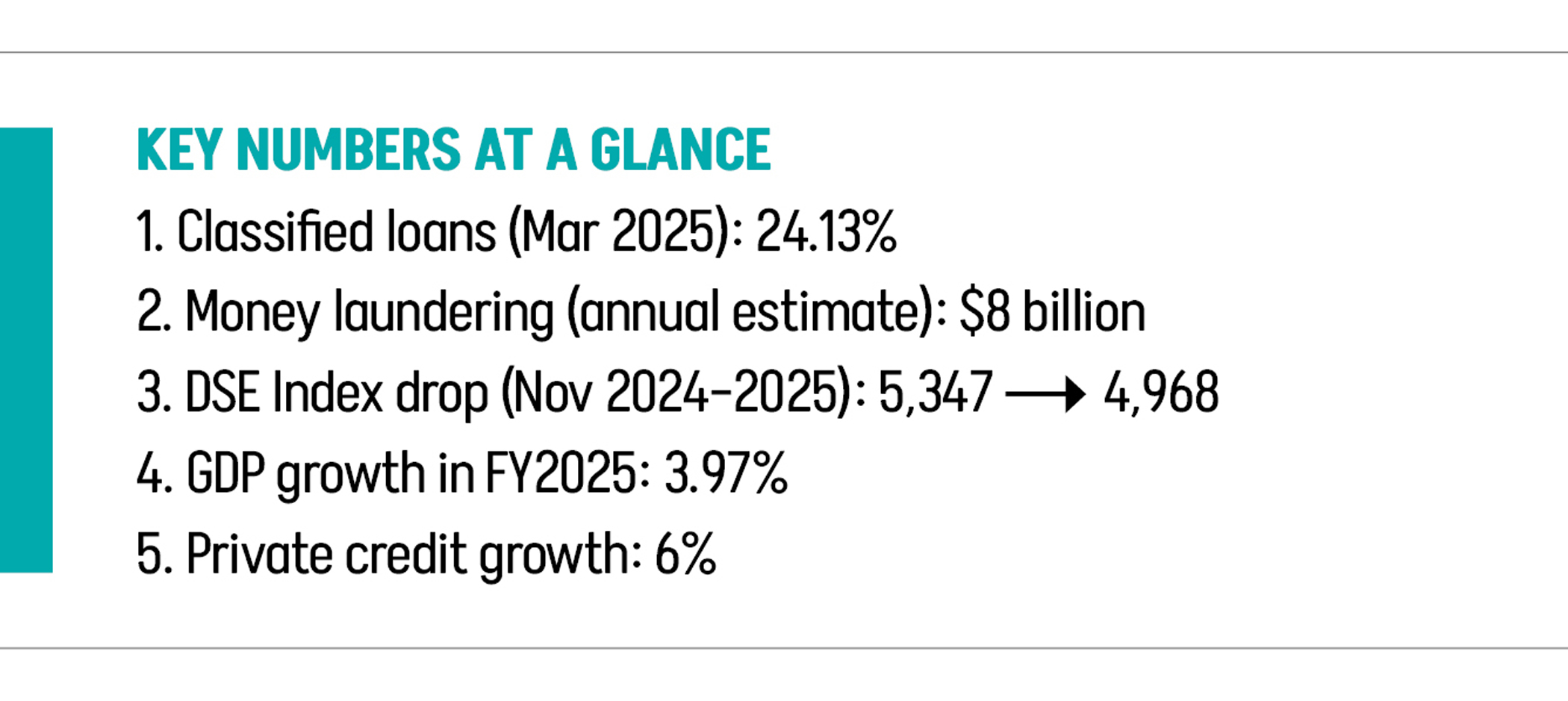 Default loans kept rising without any sign of abating. The amount of classified loans occupied 16.93 percent of total outstanding loans in September 2024, rising to 24.13 percent in March 2025. Recently, the central bank has resorted to using the sugar-coated definition of default loans, which will simply put the dirt under the carpet temporarily without delivering any viable solution. Global Financial Integrity estimates the annual figure of money laundering as around 8 billion dollars, with no evidence that this figure has gone down since the interim government took office.