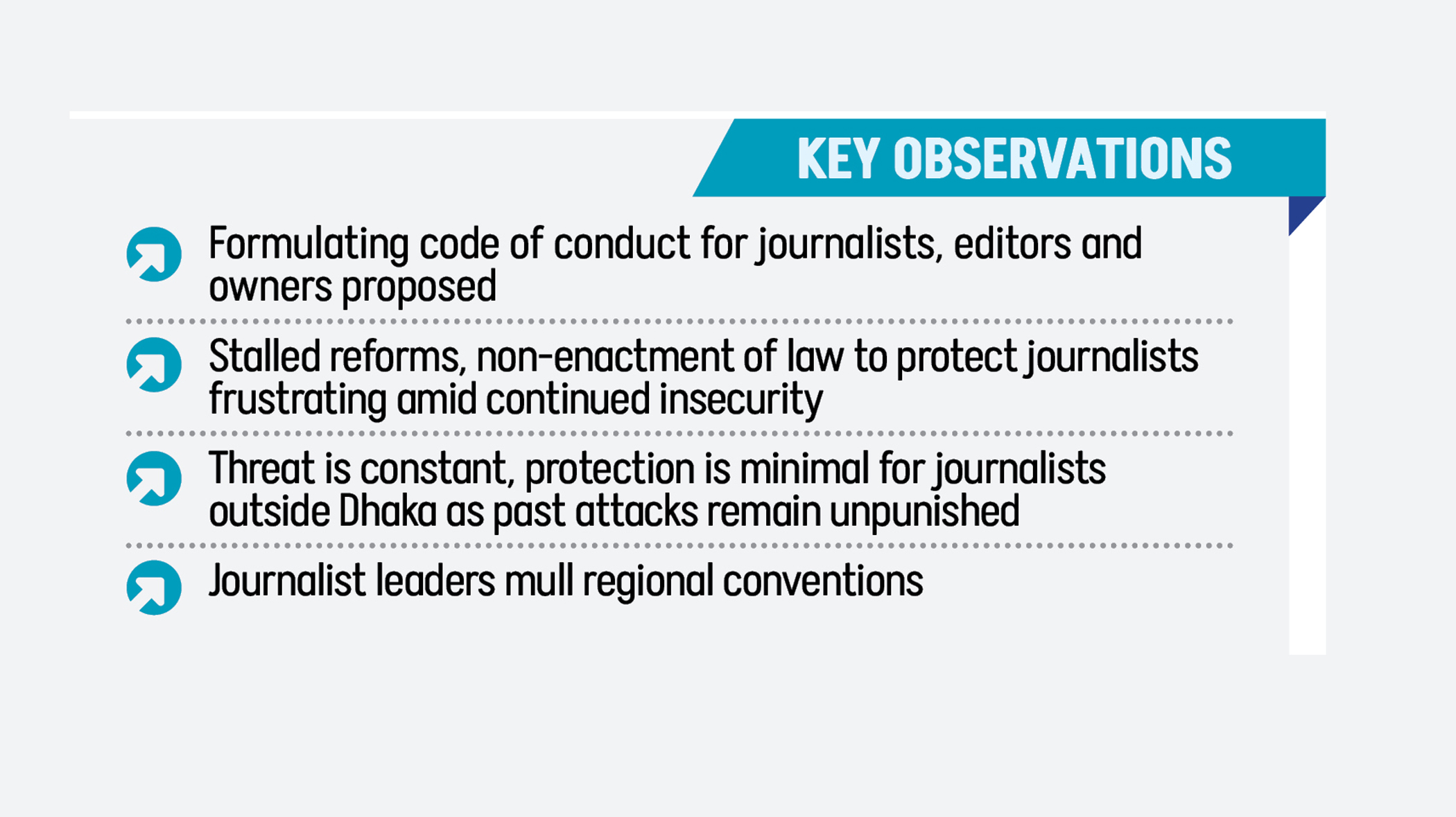 Syed Abdal Ahmed, executive editor of the Daily Amar Desh and a member of the Media Reform Commission, expressed frustration that none of the commission’s recommendations has been implemented. “The information ministry has become the main impediment. They said their power will be curtailed.”