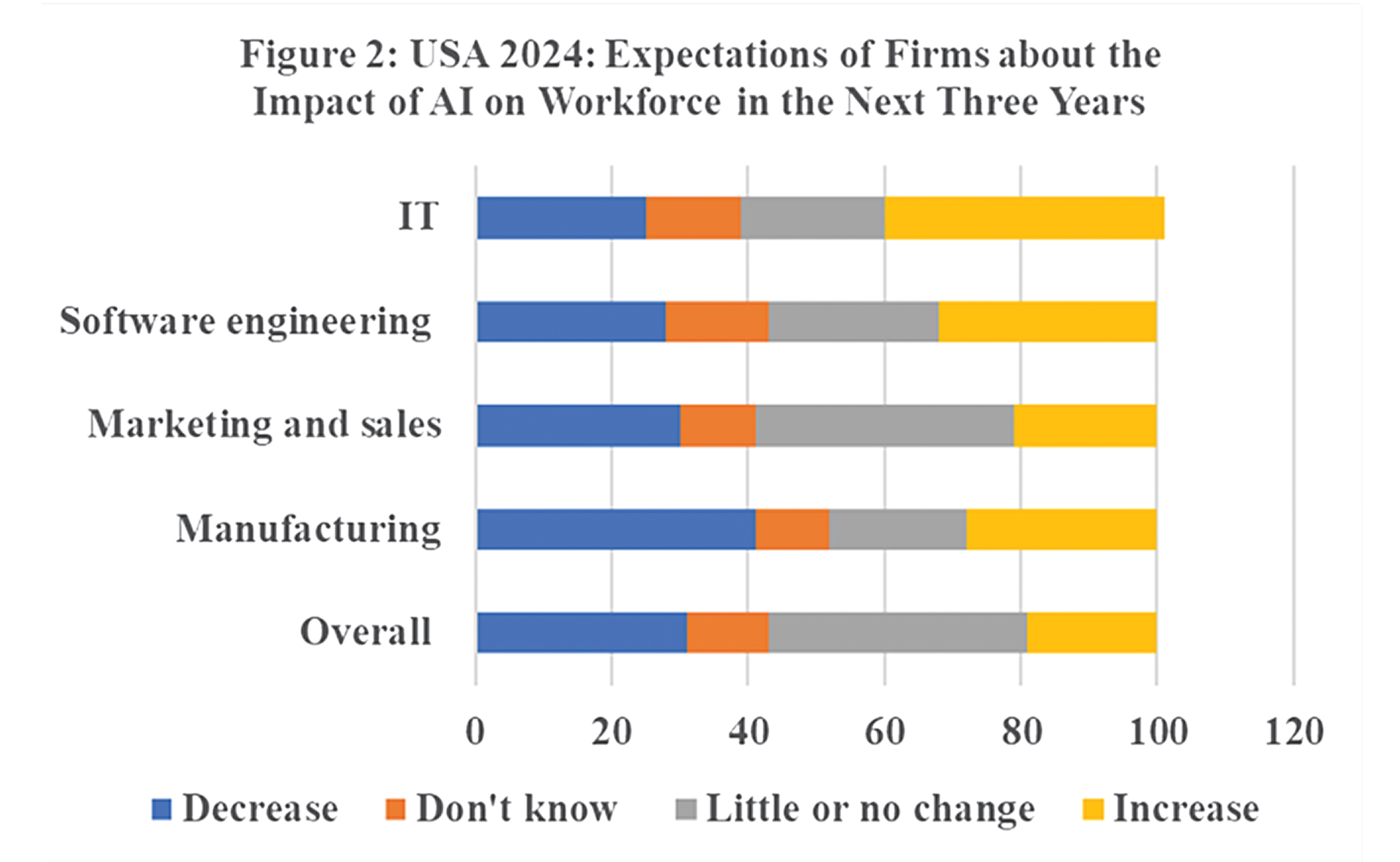 As very little research has been done in developing countries on the possible impact of AI on their labour markets, one may look at the situation in developed countries for some indication. In that context, data from a survey carried out in the USA in 2024 (Figure 2) may be relevant. If anything, this data does not support the doomsday scenario that is often painted. On the whole, less than a third of the enterprises covered expect AI to lead to a decrease in their workforce, and 19 per cent expect an increase. Taking into account those who say “little or no change,” one can say that over half don’t foresee a decrease in jobs.