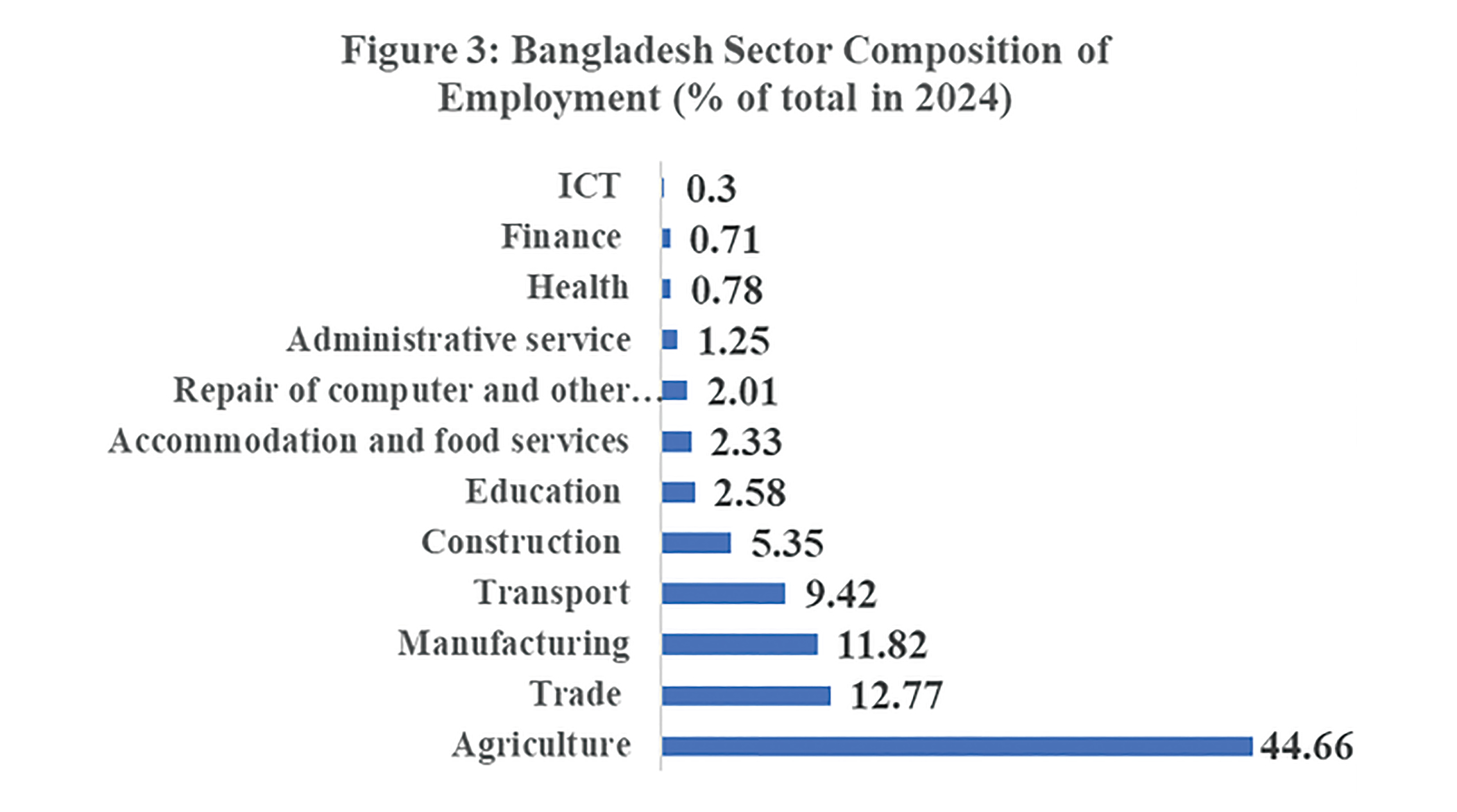 To address the above question, it would be necessary to ask whether Bangladesh is likely to see a widespread application of AI in the near future. The answer to this question, in turn, would depend on the structure of the economy and the likely speed of change in it. In that context, it is important to look at the sector composition of employment. Data presented through Figure 3 indicates that agriculture still remains the major employer in the labour market; and sectors where AI is likely to make quicker and easier inroads, e.g., manufacturing, trade, education, health, finance, etc. account for just about a third of total employment. Moreover, large proportions of the activities in some of them are in the informal segment, where the likelihood of adoption of AI is limited.