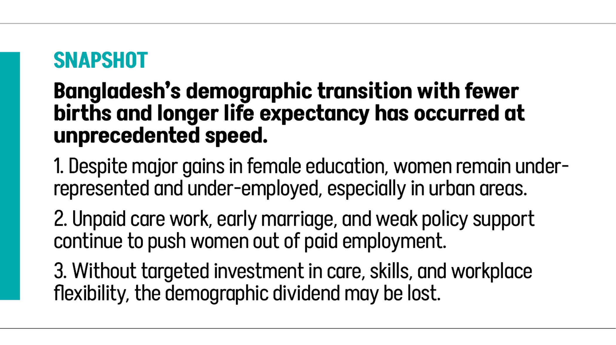 Fewer births and longer life can have promising implications for development but only if the right investments are made. These trends create favourable conditions for economic growth, for a limited period of time, when the working age population has relatively few dependents. When birth rates decline the ratio of child to adults is low. Bangladesh is now enjoying a window of opportunity of low dependency ratios when it can benefit from a relatively large workforce. However, this is only a potential dividend that depends crucially on the right investments. East Asian economies that reaped the benefits of demographic dividend to catapult themselves out of low levels of development made crucial investments in education and work opportunities for women.