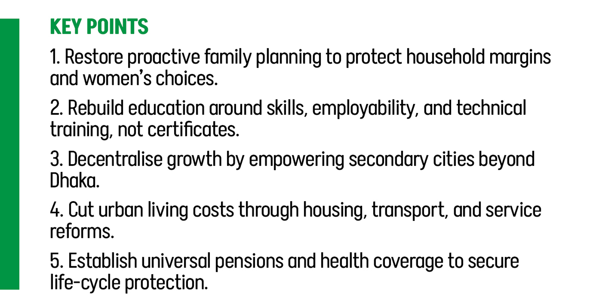 Such a shift in skills must be matched by spatial rebalancing. Dhaka cannot remain the country’s sole economic engine. Real political decentralisation requires granting fiscal and administrative power to secondary cities if they are to function as independent growth centres. Urban planning must go beyond contracts and concrete and move towards reducing the cost of living for the poor.