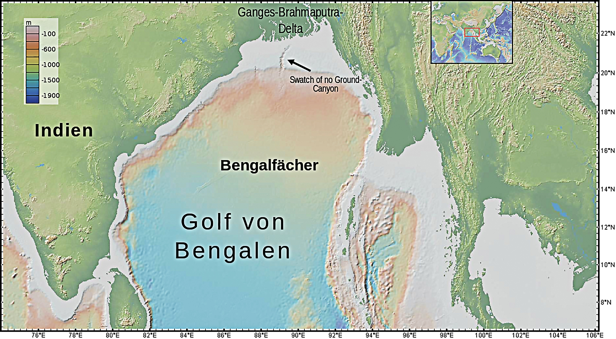 Bathymetry of the Bay of Bengal showing the submarine Bengal Fan and the “Swatch of No Ground” submarine canyon.