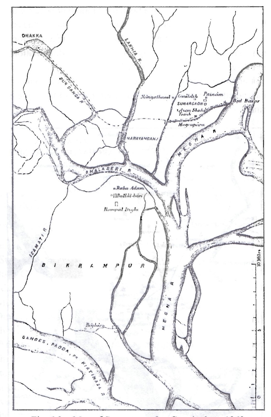 Map 2: Major rivers, Narayanganj district, Bangladesh. (Map created by Alexander Cunningham, 1879-80)