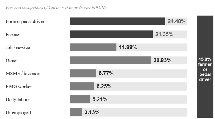 That is one of the reasons why many men are here. According to the Innovision survey used in this reporting, 21.35 per cent of battery rickshaw drivers were previously farmers, more than any other occupational group. The trend is also apparent among older day labourers and the previously unemployed: most of these men did not get drawn into a formal future. They were channelled towards a more improvised one.