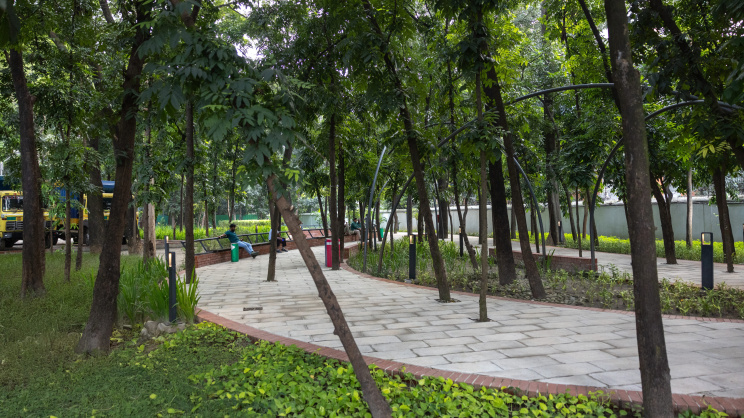 The design took shape around the natural contours of the dump. A stagnant waterhole became a restored pond that now helps manage monsoon runoff. Footpaths were carved out, trees were planted to revive biodiversity, and leftover materials from the old factory were reused in retaining walls, seating, and circulation structures.