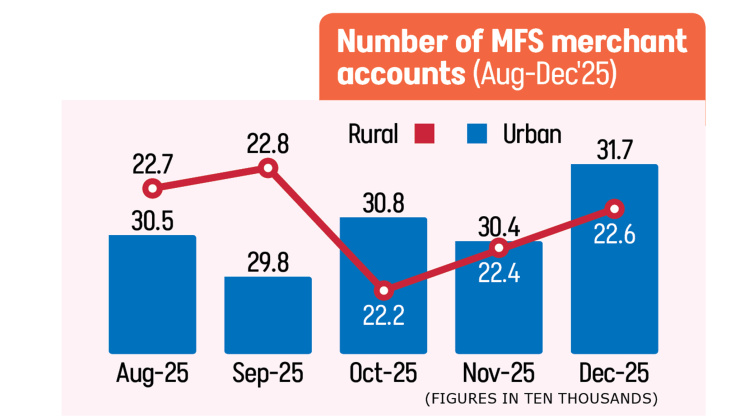 The steady rise of merchant accounts in MFS platforms like bKash, Nagad, Rocket etc is the critical bridge connecting consumers to a cash-lite lifestyle. The consistent growth in both urban and rural merchant accounts ensures that businesses move from cash-only checkouts and open doors to participate in the modern economy.