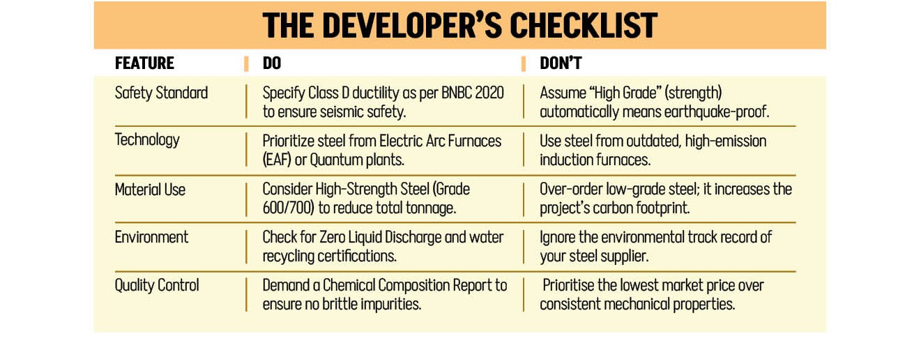 For a property owner in Bangladesh, sustainability must be coupled with safety. Given our geographic location on active fault lines, earthquake resistance is a primary concern. Dr Raquib, emphasises that for seismic resilience, "ductile steel, which can elongate longer before failure, must be used."