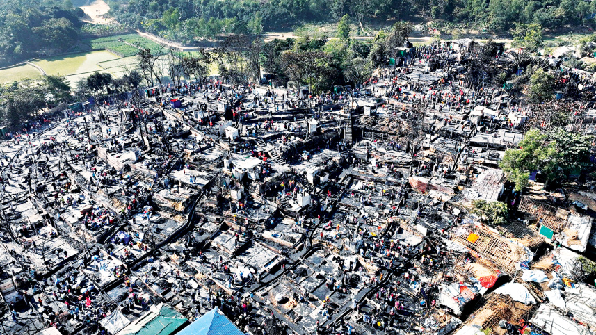 A fire reduced more than 500 shelters and other facilities to ash at the Palongkhali Rohingya refugee camp in Ukhiya, Cox’s Bazar, early yesterday. Photo: Courtesy of IOM