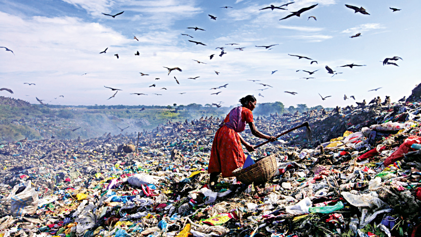 Under a clear blue sky, a woman scavenges for metal and plastic scraps to sell to recyclers at the Paroir Chak landfill of Sylhet City Corporation in Dakshin Surma, as smoke from small fires rises and birds circle overhead. The photo was taken recently. Photo: Sheikh Nasir