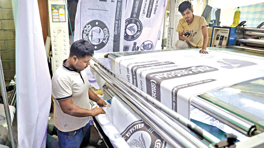 Printing presses in the capital hum with activity, churning out leaflets and banners for the election campaign as formal electioneering begins today. The photo was taken at a press in Fakirapool yesterday. Photo: Star