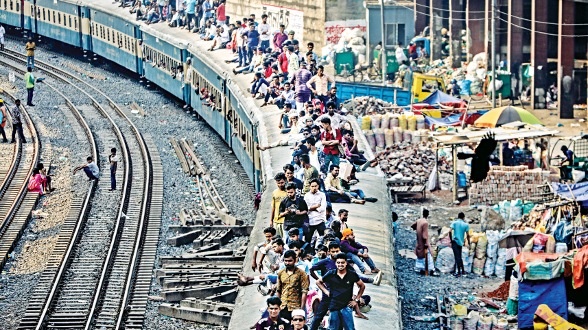 People ride on the roof of train carriages as the rush of Eid holidaymakers returning to the capital continues. This photo was taken from Khilgaon Flyover close to Kamalapur Railway Station in Dhaka around 4:00pm yesterday. Photo: Mehedi Hasan