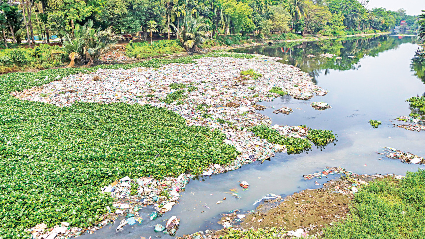 Non‑biodegradable waste clogs the Mayur River in Khulna, disrupting its flow and causing severe pollution. Polythene, plastic bottles, and other discarded materials are narrowing the channel, leading to stagnant water and raising the risk of waterlogging during the monsoon. The pollution also threatens local livelihoods, agriculture, and aquatic life. The photo was taken in the Gallamari area yesterday. Photo: Habibur Rahman