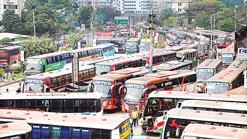 Illegally parked buses in the middle of the road obstructing vehicular movement and triggering traffic congestion near the Mohakhali bus stand in Dhaka yesterday. PHOTO: PALASH KHAN