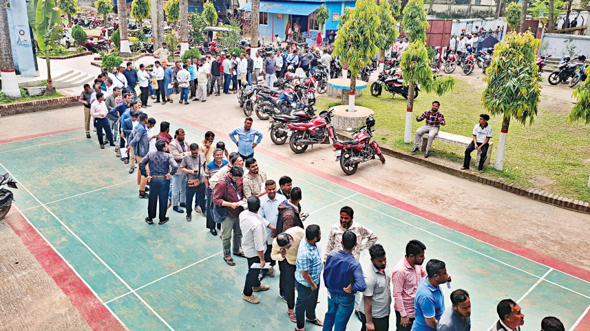 Motorcyclists line up at a municipality office in Thakurgaon town yesterday to collect “fuel cards” now mandatory from April 5 amid the ongoing fuel crisis. Similar lines were seen at UNO, municipality, and DC offices in the district as drivers scrambled to secure the required permits. PHOTO: MD QUAMRUL ISLAM RUBAIYAT