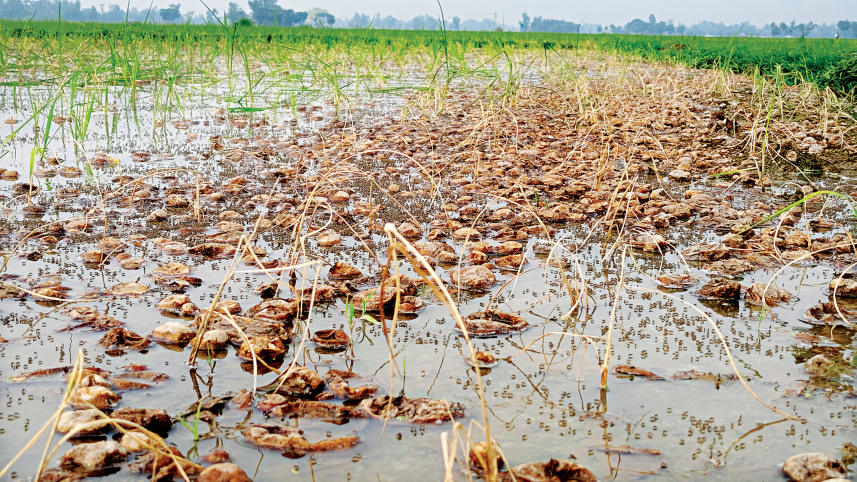 After potatoes were destroyed by stagnant rainwater, farmers of Shibganj upazila in Bogura and neighbouring Kalai upazila in Joypurhat faced a double whammy. They planted paddy over the unharvested potatoes, but the new crop has also failed. This photo was taken in Shibganj yesterday. Photo: Mostafa Shabuj