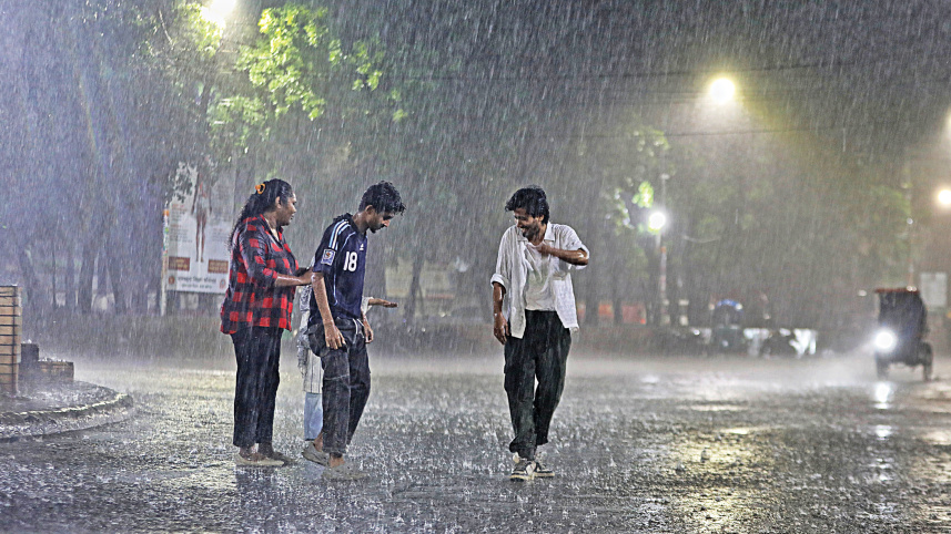 DANCIN’ IN THE RAIN … Young people enjoying a sudden downpour at Dhaka University’s TSC last night. The rain, coming after a few days of scorching heat, provided a fleeting moment of relief and release. Photo: Mehedi Hasan