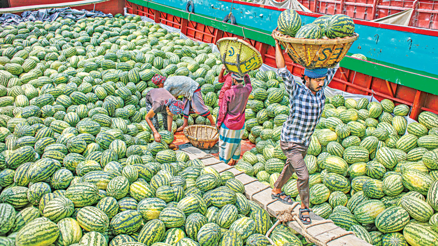 Workers unloading watermelons from a cargo vessel at the Sadarghat Launch Terminal in Dhaka yesterday. As the harvesting season peaks, massive shipments of the juicy fruit are arriving in the capital from the southern districts. Wholesalers are selling 100 watermelons for between Tk 10,000 and Tk 15,000, depending on their size. Photo: Rashed Shumon